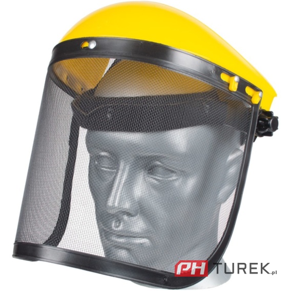Model wyposażony jest w wytrzymałą siatkę ochronną zapewniającą dobrą widoczność oraz daszek z poliwęglanu, który dodatkowo chroni przed odłamkami i słońcem. Regulowana konstrukcja pozwala na łatwe dopasowanie zarówno siatki, jak i nakrycia głowy do użytkownika.